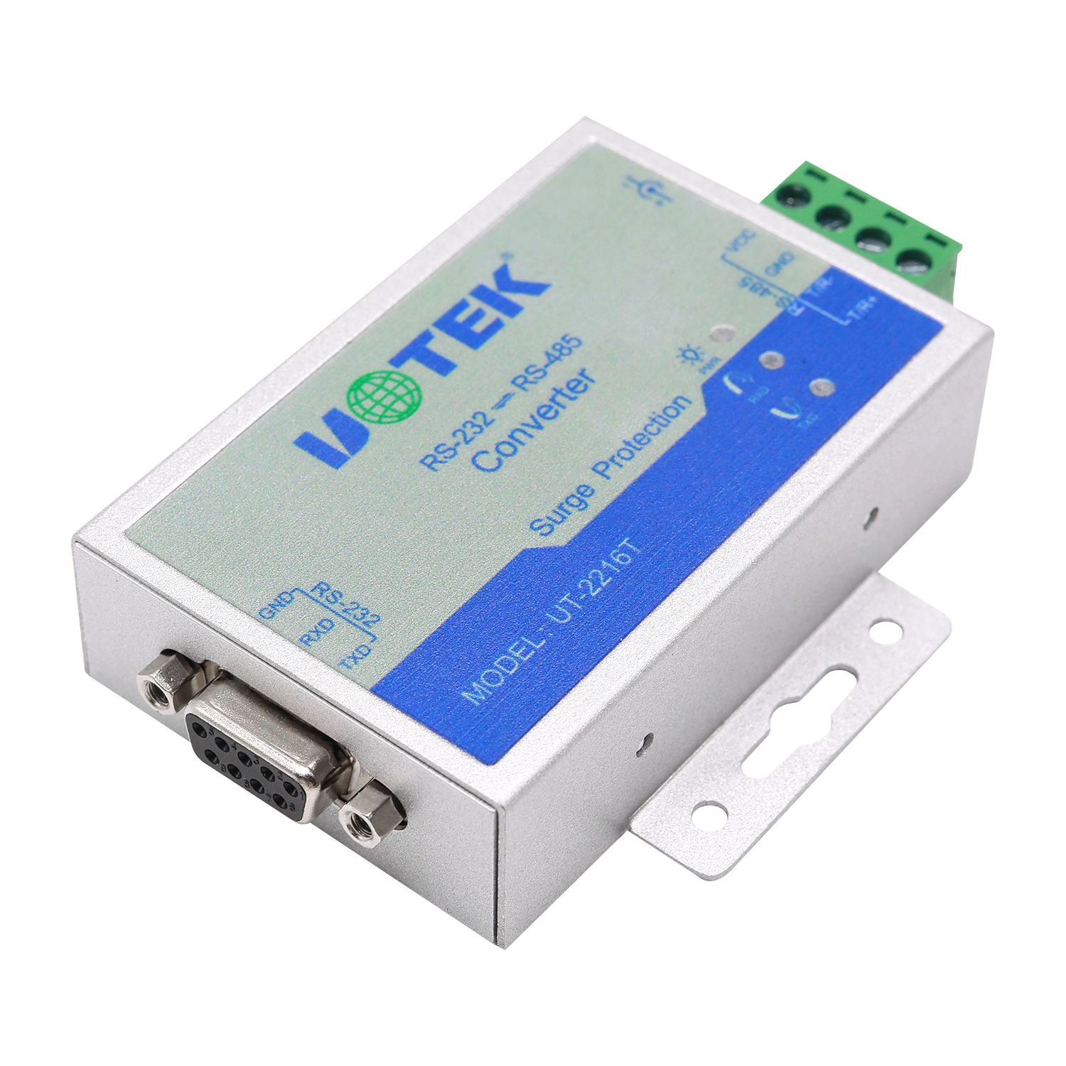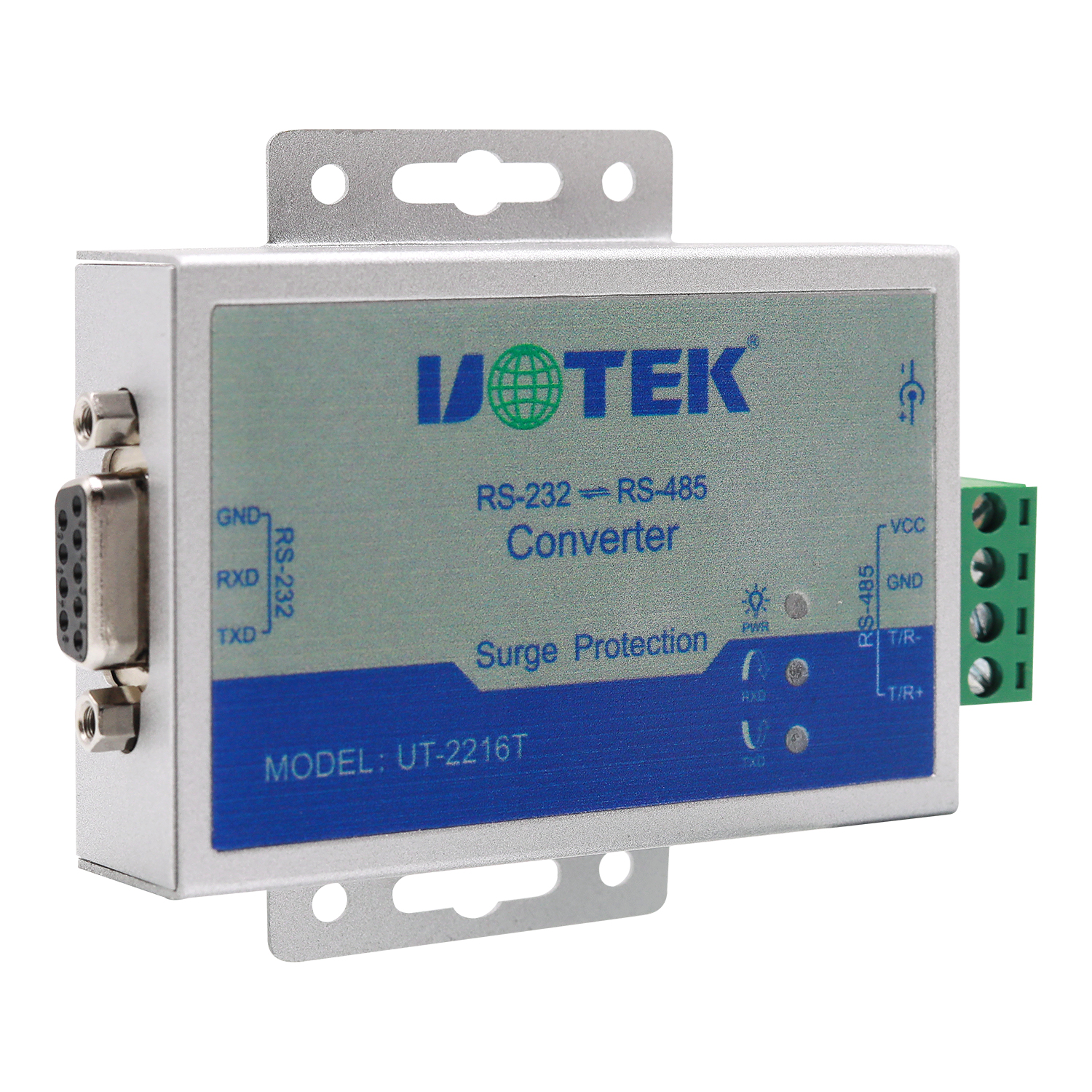 安裝UT-2216T接口轉換器前請先仔細閱讀產品說明書,將RS-232通信電纜、電源(9-24VDC)、RS-485通信電纜分別接入對應接口。本產品采用DB9F(或5.08三位接線端子)和5.08四位接線端子,無需跳線設置自動實現RS-485通信方式,可使用雙絞線或屏蔽線,連接、拆卸非常方便。 TXD代表RS-232發送數據,RXD代表接收數據。T/R+T/R-代表發送、接收A+/B-,VCC 代表輸入電源, GND 代表公共地線,支持點到點、點到多點、半雙工通信接兩根線T/R+、T/R-。